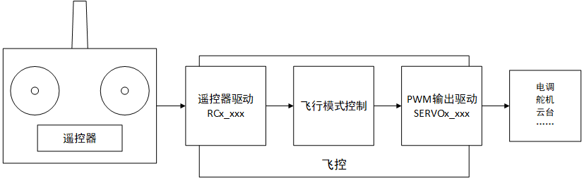 - 飞控收到遥控器的信号后,根据“RC”类参数,将各个通道的值从“1100~1900”这种PWM值归一化为“-1.0~1.0”这种标准值,从而对于后面的飞控模式控制代码来讲,已经无需关注用户使用的是哪款遥控器,通道行程设置的是多少;