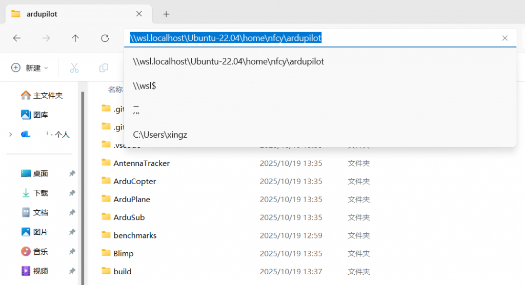在Win11的“此电脑”的地址栏输入如下地址,然后“回车”,可以直达Ubuntu子系统中的ardupilot文件夹,非常方便。
