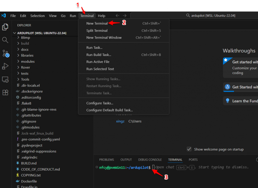 5、可以单独打开一个独立的Ubuntu终端,切换到ardupilot目录进行编译;也可以在VScode中打开内嵌的终端,然后进行编译。这两种方法本质上都是调用了Ubuntu子系统的终端,因此其效果是一样的。
