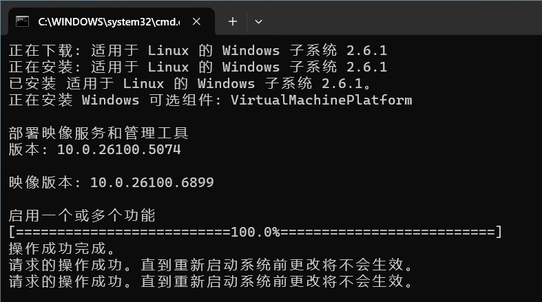 安装完成后输出如下(注意安装完成后按照提示重启电脑):